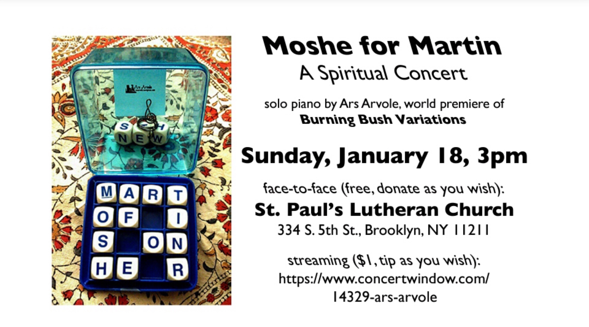 A note on Moshe for Martin, coming in 5 days: “We were slaves to Pharaoh in Egypt, but the Lord brought us out…” I read aloud with a friend, his family, and their guests at the first Passover Seder I attended in a home. To recite the suffering coupled with the deliverance is a powerful ritual I never experienced in the African-American community. We were slaves, and while equality still eludes many, our lives are much better than they were before. I can go to school from kindergarten through doctorate, study a field of my choosing, and get a job teaching anyone’s child who wants to study my field at my institution. Giving this concert on the eve of Martin Luther King, Jr. Day is a way of recollecting what we were and what we are.